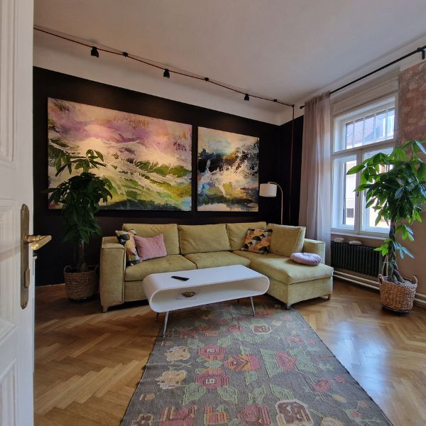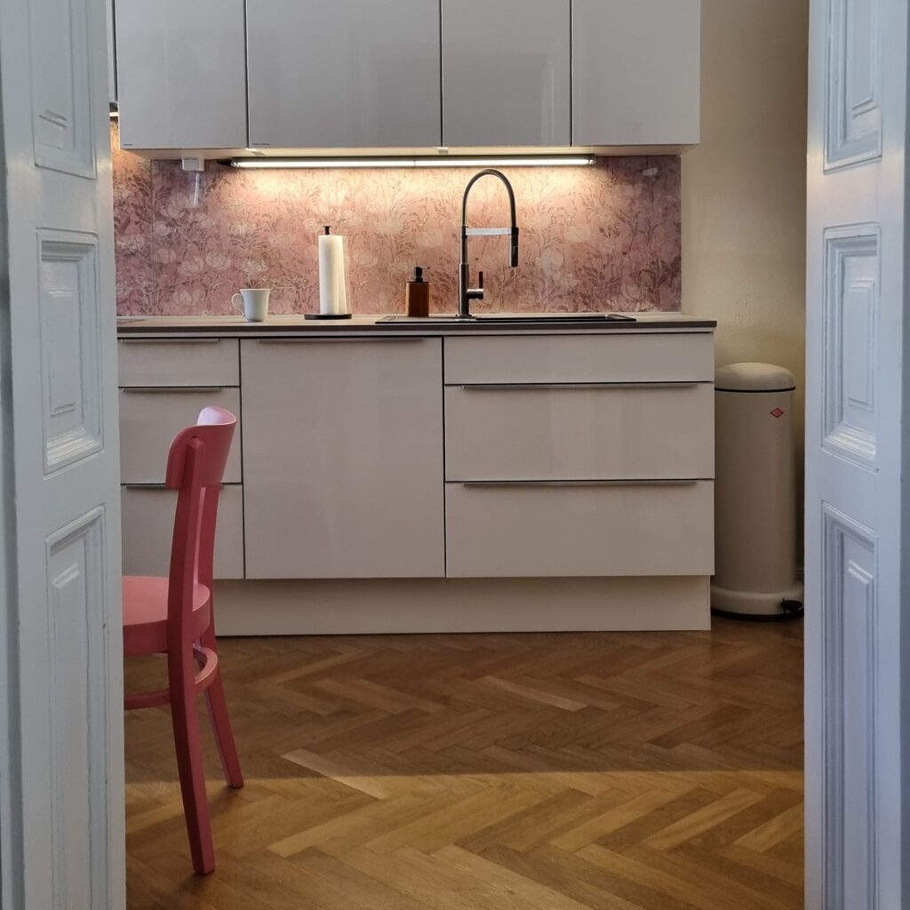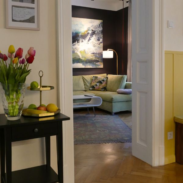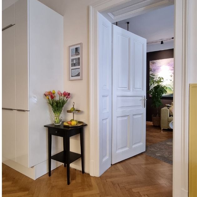 Anno 1903 bietet Altbaucharme pur – mit 3,10 Meter hohen Decken, angenehm knarzendem Fischgrätparkett, ein paar bei der Sanierung geborgenen Murnockerln und historischer Schablonenmalerei, die zusammen mit moderner Kunst eine ganz besondere Atmosphäre schaffen: ein Ambiente, das Charakter hat und dennoch leicht und einladend wirkt.